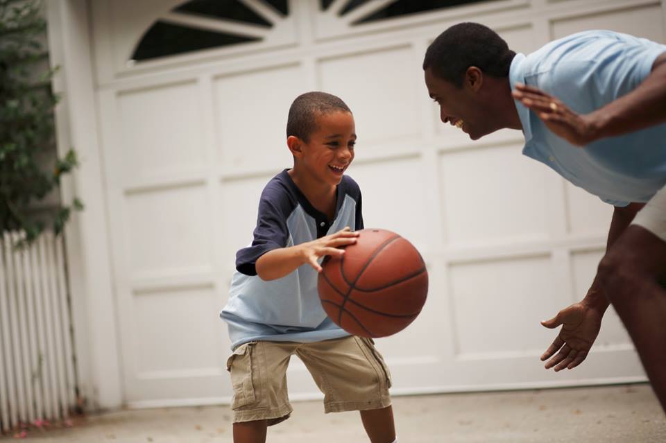 Outdoor basketball game between father and son.